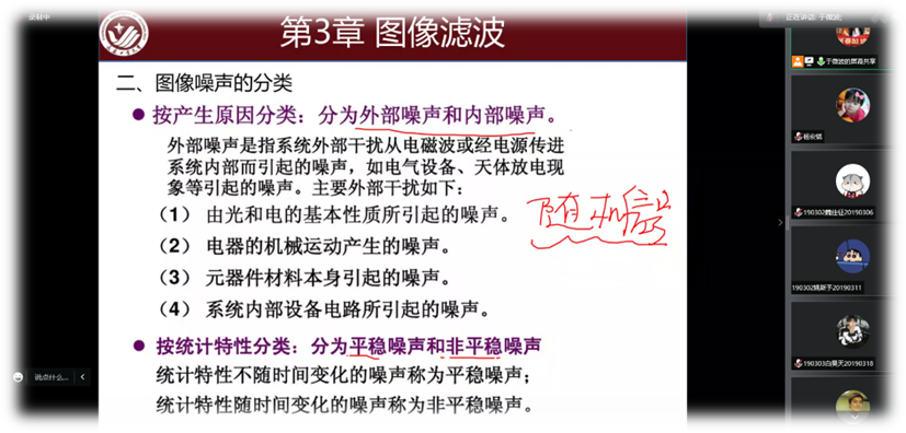 于微波老师的“数字图像处理与机器视觉”课程,利用腾讯会议进行线上授课,并形成课程视频录制,便于学生课下观看复习。课堂上,于老师通过签到、点名提问、讨论区互动、算法仿真实验等形式,及时了解学生听课状态。PPT课件与算法仿真实验验证有机结合,使得线上课堂如线下一样精彩。