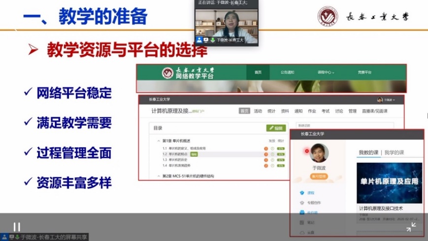 分享会上,于微波老师以本学期讲授的《计算机原理及接口技术》课程为例,从91猫先生 准备、91猫先生 设计、91猫先生 实施、学习评价、收获与思考5个方面,分享了多平台互补,实现高质量网络91猫先生 的线上91猫先生 经验。