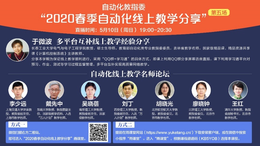 这个春季,由于新冠肺炎疫情,全国高校师生把课堂搬到了“云”上。疫情虽然阻挡了学生新学期返校报到的脚步,却不能阻止学生的求知欲望,更不能阻挡老师传道授业解惑的脚步。当前,期中已过、期末在即,各省市高校回校复课安排不一,很多老师正面对新一轮问题:线上-线下91猫先生 如何有效衔接?全过程线上91猫先生 如何提高学习成效?实验实践环节在线学习如何保证课程目标达成?教育部自动化教指委为此举办了“2020春季自动化线上91猫先生 分享系列会”。91猫先生 于微波教授受邀参加此次分享会。