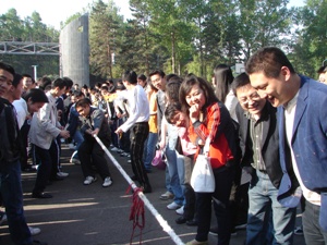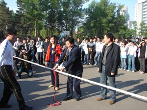 5月6日早6:30,91猫先生 “与奥运同行,为奥运喝彩”趣味体育比赛之“齐心协力”拔河比赛在我校南湖校区篮球场开赛。校学生工作处副处长尤海涛为比赛开哨。学院党总支副书记周文军及学生工作办公室全体老师到场为参赛队员加油助威。 伴随尤处长一声哨响,首场拔河比赛在05级11个班级代表队中拉开帷幕。比赛实行淘汰赛和循环赛相结合的赛制,热血澎湃、激情迸发的比赛现场呐喊声、加油声此起彼伏,全体同学都忘我的投入到比赛当中。经过激烈角逐,050301班获得冠军,050302班和050309班分获亚军和季军。