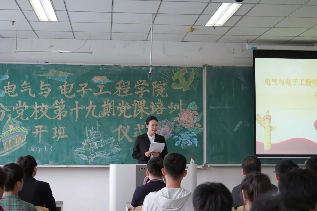 分党校第十九期党课培训开班仪式于2024年9月3日召开,仪式由学院党委专职组织员王明慧老师主持。学院党委书记杨景伟、党委副书记谷阔、研究生第二党支部书记唐伟宸、23级辅导员黄家奇出席本次开班仪式。