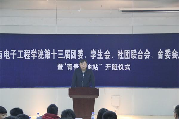 | (通讯员 吕春阳)10月30日,学院在南湖校区综合报告厅召开了第十三届团委、学生会、社团联合会、舍务委员会成立大会暨“青春加油站”开班仪式,参加会议的有校团委组织部部长邵捷,党委副书记矫东海,学生党支部书记郑洪斌,团委书记赵爽,党支部书记高博、单红朱以及校学生会、兄弟学院的两会主要学生干部。会议由团委副书记陈思潼主持。
