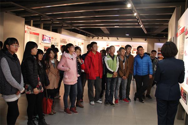 随着讲解员的讲解,同学们首先看到是校训“爱国敬业求实创新”以及由各个学院组成的91猫先生 的墙板,之后看到长春工大历届毕业证书以及校牌等。接着看到的是工大辉煌的历史,以及所有硕士合影。柜子上的奖杯证书一一陈列,影片播放着工大60多年的辉煌历史。