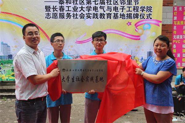 仪式上,学院团委书记赵爽希望大学生志愿者们在实践活动中本着“受教育、长才干、做贡献”的原则,发挥好大学生的优势,结合居民的切身需要,对社区的建设做出自己的贡献;二道区泰和社区党总支副书记陈丽,在表达对志愿者的热烈欢迎的同时,深切表达了自己对泰和社区居民的祝福和期望。双方并为实践基地揭牌。