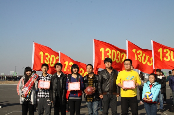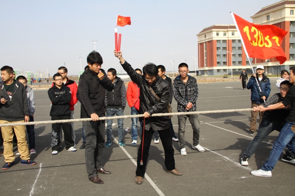 决赛对阵的双方为130301班和130309班,只听一声哨响,同学们脚紧紧地踏着地,身子往后仰着,拉拉队的同学们拼命的喊着口号,各参赛队员都为一个共同的目标,进入忘我的境界。赛场上不断涌现出一浪高过一浪的欢呼声。经过三局两胜制的决赛,最终130309 班实力更胜一筹,荣获第一名,130301 班获第二名,130302 班获第三名。朱博和冷帅为获奖班级代表颁奖并合影留念。