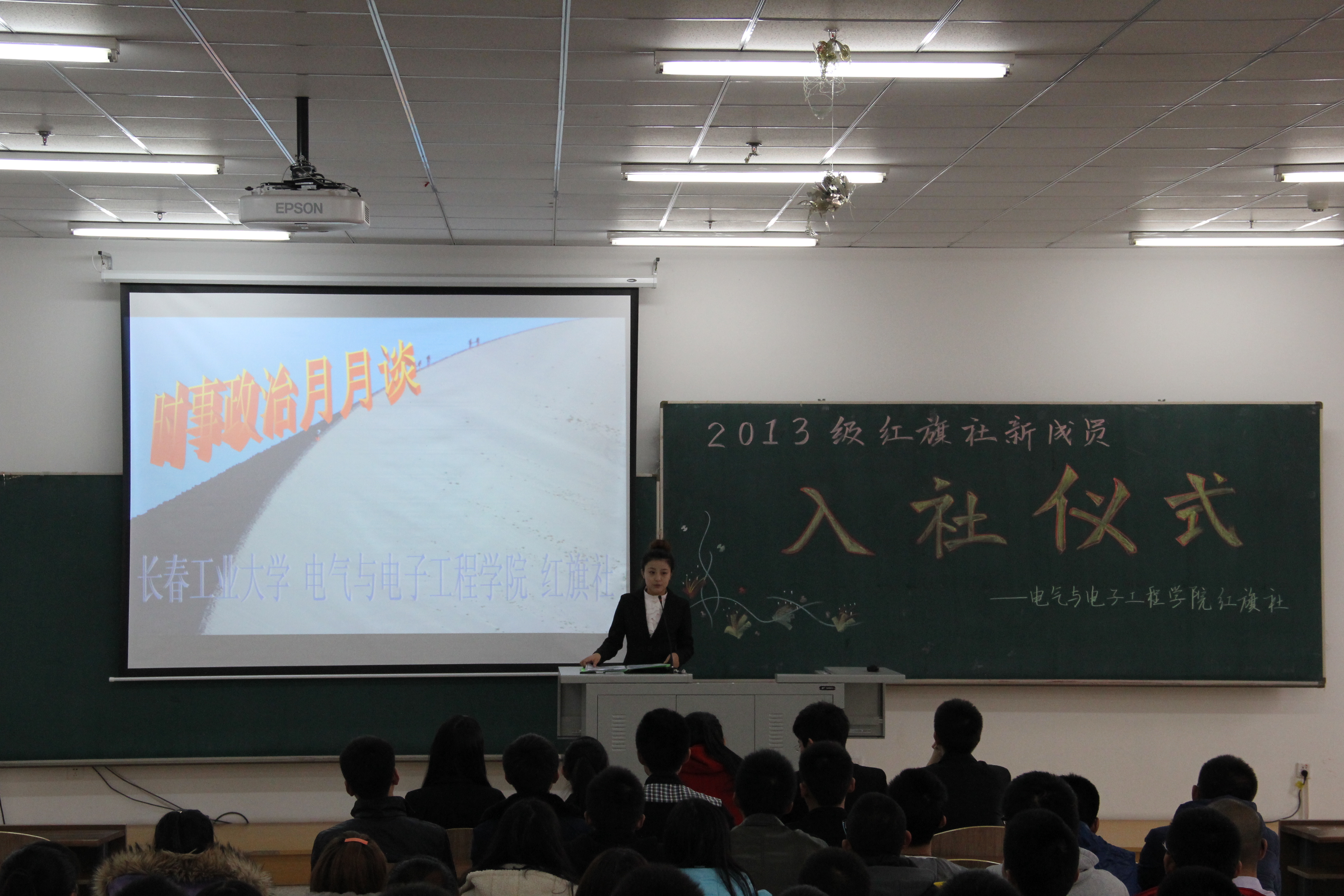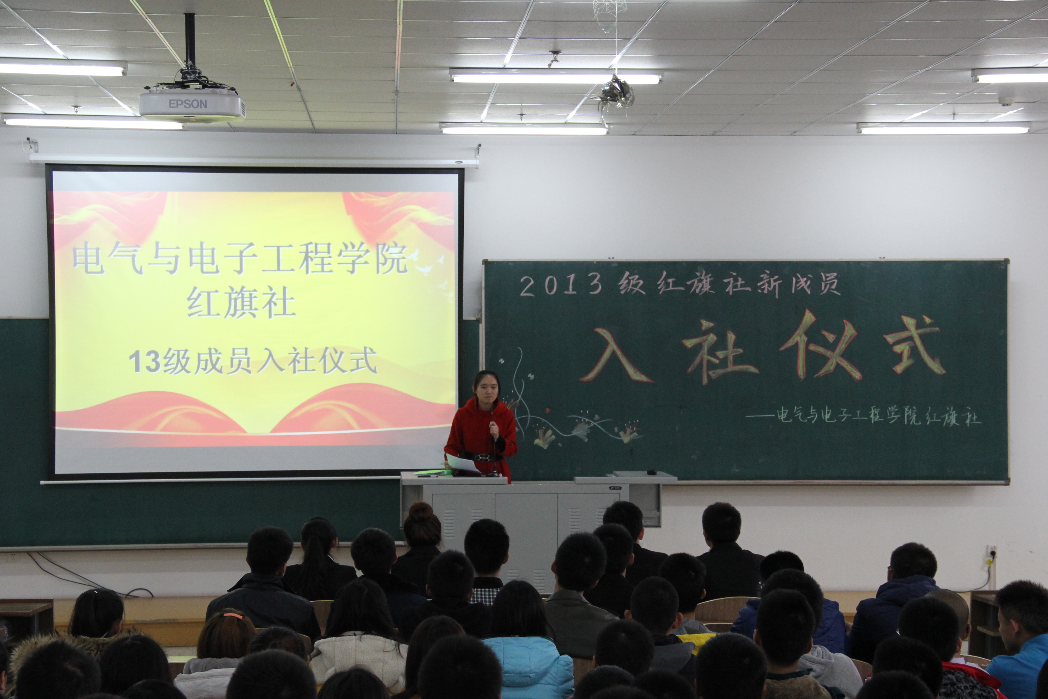 | (通讯员 王冠达)11月9日12时30分,学院红旗社于北湖校区东阶301教室举行13级新社员入社仪式。出席本次入社仪式的有团委副书记兼红旗社社长夏天竺,副社长李雯茜,陈思潼,邵莘尧及各理论学习部门副部长等。