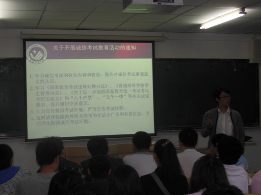 系列活动之二:诚信考试,拒绝舞弊动员会 5月中旬,学院各年级辅导员召开了年级会,和同学们学习了《国家教育考试违规处理办法》、《普通高等学校学生管理规定》等有关规定要求,提升了同学们对诚信考试重要意义的认识。