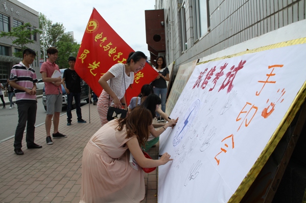 | (通讯员 孙淼)为了贯彻落实吉林省招生委员会和吉林省教育厅《关于开展诚信教育考试活动的通知》的通知精神,近日,学院举办了诚信考试主题教育系列活动。 系列活动之一:诚信考试手印会 5月28日中午,党员先锋队在我校南湖校区食堂门口举办了诚信考试手印会。通过前期宣传,手印会现场,志愿者们向同学们宣传诚信考试,其他兄弟院校同学们也都积极参加本次活动,鲜红的手印印满了诚信考试的宣传板,也证明了同学们关于诚信考试的承诺和信心。