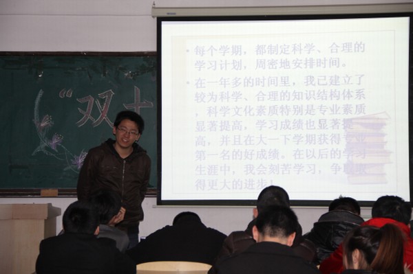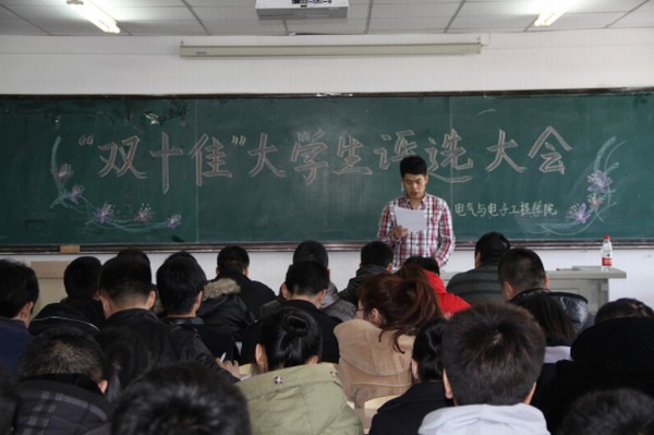 学院党委高度重视“双十佳”大学生评选活动,学院学生会精心组织,广泛宣传,于3月11日公布了“双十佳”大学生评选活动方案,其中详细的公布了评选范围、评选程序、时间安排、表彰奖励、活动要求。经过报名以及班级初选,各班推选出了的综合素质过硬的学子精英。评选会上,同学们通过精心准备的PPT来介绍自己的个人优势,许多同学在大学生活中获得了令人瞩目的成就令评委和在座的各位候选人感叹,台下爆发了阵阵掌声。评选小组认真听取了每位候选人的事迹材料。本着公开、公正、公平的原则,评委们将优中选优,经过认真的初选和复选,评委们评选出2012年度“双十佳”大学生的最终人选。