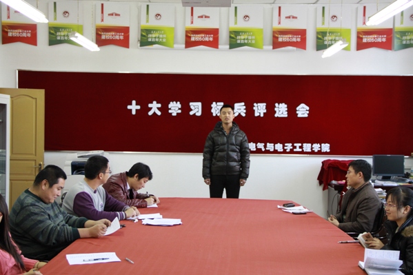 | (通讯员 夏天竺)为了进一步加强学院学生的精神文明建设,提高学生的自身素质,推动学风和校风的不断发展。11月26日12:30,学院在南湖校区主楼1303室开展了“十大学习标兵”评选活动。学院党委副书记周文军,学生党支部书记郑洪斌,团委书记赵爽,学生支部书记朱博以及学院团委、学生会、社团联合会、舍委会的主要学生干部担任评选团。