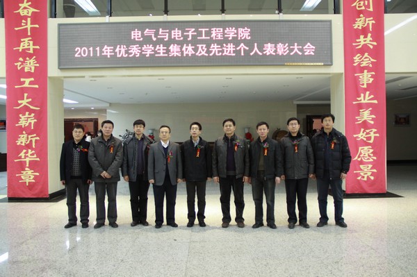 表彰大会在庄严的国歌声中拉开帷幕。首先,学院党委副书记周文军宣读了关于2011年度电气电子工程学院优秀学生集体及先进个人的表彰决定,大会共对高忠义等十大学习标兵,冯壮等16名科技竞赛标兵,任秀英等25名单科状元,徐超等10名学团干部标兵,包健等20名文艺活动骨干,赵俊博等23名文明大学生,090310班等5个优秀学生班集体,6栋602等20个文明寝室,进行了表彰奖励。与会领导为获奖集体和个人颁奖。