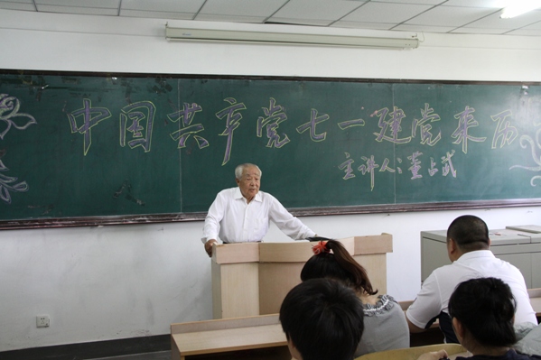在主楼1401室举行中国共产党七一建党来历专题讲座,学院关工委常务副主任董占武主讲,学院学生党支部书记郑洪斌、赵爽参加此次活动。