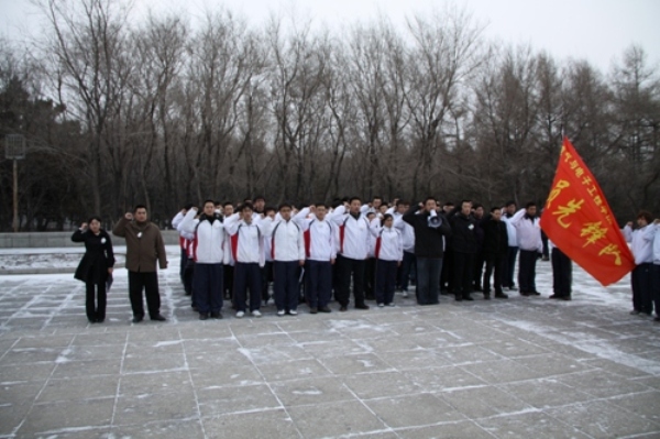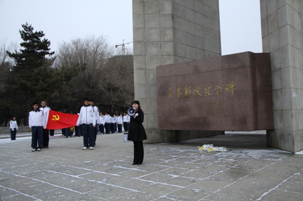 院团委副书记张哲同学宣读本次活动的目的及意义,天气虽然寒冷,但一声声的讲词使得同学们不畏严寒,表达了同学们对先烈的敬重之情。党员代表向烈士纪念碑献花,两束雪白的鲜花是同学们的敬意的表达,是激励同学们前进的动力。在赵爽老师带领下党员同学们举起右手在烈士墓前面对党旗庄严宣誓,铿锵的誓言激励同学们时刻以党员的身份严格要求自己,做模范带头作用,学习先烈的英勇无畏。最后由学生代表院学生会主席董丰嘉同学发言,我们要牢记自己的使命,不忘先烈遗志,继承先烈们的光荣传统,从一点一滴做起,中华民族伟大复兴的开拓者,弘扬“奉献、友爱、团结、进步”的时代主旋律,勤奋学习。学生党支部书记郑洪斌老师在总结发言时希望大家珍惜今天,把握明天,创造未来。