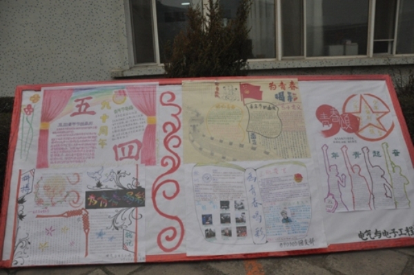 为青春喝彩 ——我院举行纪念五.四运动九十一周年手抄报比赛 2010年5月4日下午4点整,我院学生会宣传部组织09级学生举行了“为青春喝彩”纪念五.四运动九十一周年手抄报比赛。手抄报在我校老图书馆前展出,供广大同学评阅。白城师范学院机械电子工程系辅导员纪长亮,学院党委副书记周文军,团委书记矫东海,学生党支部书记郑洪斌、赵爽,学生工作办公室辅导员单洪朱,高博,朱博老师参加最终评比。