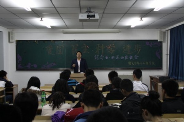 爱国,民主,科学,进步 ——我院举行纪念五四运动九十一周年座谈会 2010年5月5日晚6:30,我院在主楼1403教室举办了“爱国,民主,科学,进步”为主题的纪念五四运动九十一周年座谈会,学院学生党支部全体党员同学参加座谈会,学生党支部书记赵爽老师主持本次座谈会。