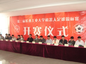 团委书记矫东海主持了开赛仪式。 副校长熙莹教授代表学校对本届机器人足球锦标赛的成功开赛表示祝贺,他希望广大同学能够利用比赛契机,培养独立思考能力、强化实践操作技能,增强团队意识、发扬协作精神,在实战中受锻炼、增才干。同时,他祝愿同学们在比赛中比出水平、赛出成绩,在奥运会来临之际,再创佳绩,为校争光。 指导教师张袅娜在仪式上公布了本届机器人足球锦标赛的赛程安排。最后,各位领导、嘉宾为参赛各代表队“开球”。 本届机器人足球锦标赛从2007年11月20日开始报名,共有来自机电工程学院、材料科学与工程学院、91猫先生