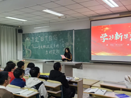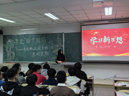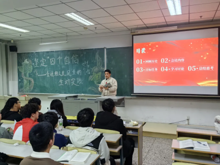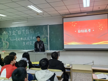 会议结束后 , 同学们以小组为单位自发思考,并上台讲述自己小组的观点和看法,进行交流沟通,并讲述了自己对自信的新的认识。自我的自信来自于国家的自信,随着时代的飞速发展,正是因为我们中华民族不忘初心、砥砺奋进、自强不息、牢记使命,才会让我们可以挺起胸脯享受如今的幸福生活。