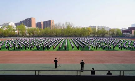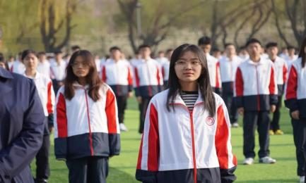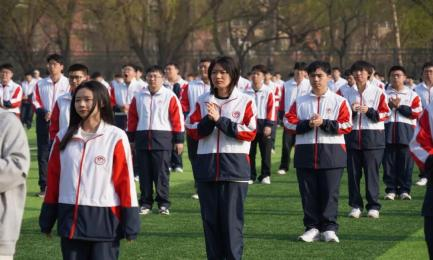 在全体师生的注目下,国旗护卫队昂首阔步,动作整齐划一,他们满腔热忱,敢担重任,眼神坚定地护送着国旗来到升旗台下,五星红旗在熠熠晨光中随风飘扬,映衬着此刻庄重严肃的气氛。