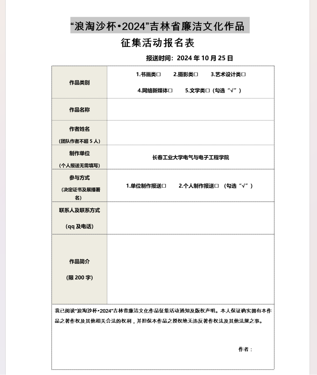 报名者将《活动报名表》和投稿邮件(书画类、摄影类、艺术设计类作品的多角度高清图片和不超2分钟创作过程视频,新媒体类、文学类作品的电子版),于10月25日前打包发送到邮箱:[email protected];文件名称统一为“类别+名称+个人姓名+联系电话”。评比结果揭晓后,学院将与获奖作者联系,酌情征集作品实物。