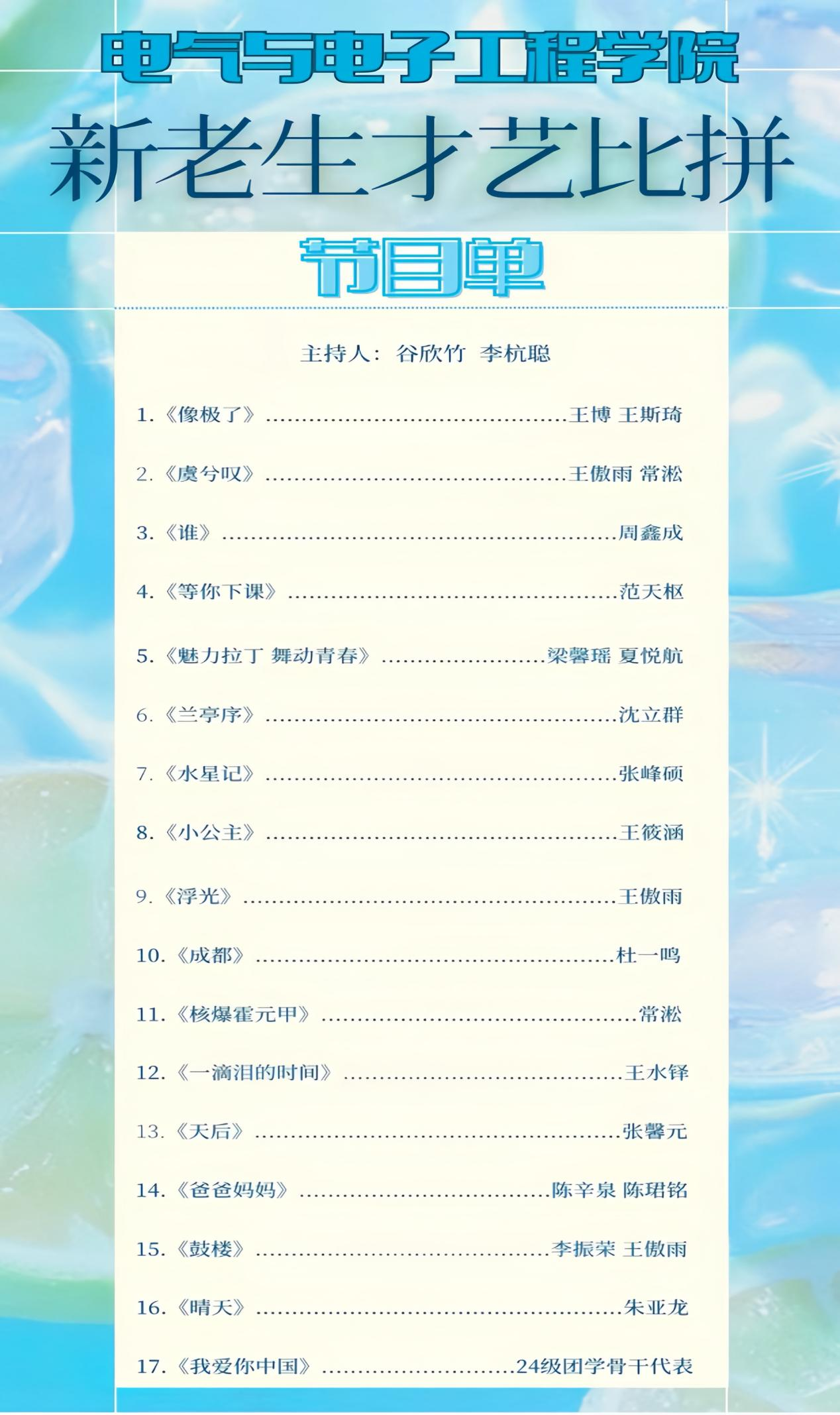 本次才艺比拼由谷欣竹、李杭聪两位同学共同主持。演出在王博、王斯琦合唱的《像极了》中拉开序幕,随后王傲雨、常淞合作演唱《虞兮叹》,周鑫成独唱《谁》,范天枢倾情演绎《等你下课》,为现场营造了温馨的文艺氛围。