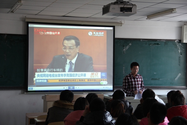 活动中,主持人窦金彪向大家介绍了党的十八届三中全会的背景及总体部署,并通过视频让同学们了解李克强总理及各位专家学者对国内经济问题的研讨与分析,以及国内外各大媒体对党的十八届三中全会的评论,大家深刻地理解了“深化改革”这一主题的重要意义。之后,他还介绍了党的十八届三中全会的主要流程以及历届三中全会出台的重大措施。最后,郑洪斌做总结,他鼓励在座同学关注并学习党的十八届三中全会的重要内容,以此明确自己今后的职业规划,积极与同学们一起沟通交流,掀起学习党的十八届三中全会精神的热潮,努力开拓思维,提升自身综合素养。