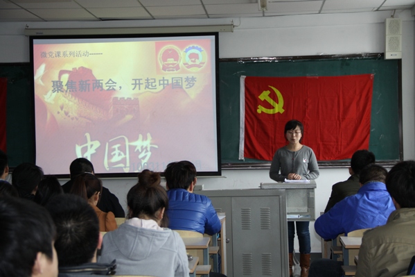 (通讯员 冯畅)为了进一步学习和贯彻“两会”精神,提高同学们的政治素养和思想觉悟,4月9日中午,学院于主楼1401开展微党课系列活动之“聚焦新两会,开起中国梦”理论学习活动。学生党支部书记郑洪斌和10、11级的所有入党积极分子、党员参加了活动。微党课由100311班党小组冯畅同学主讲。