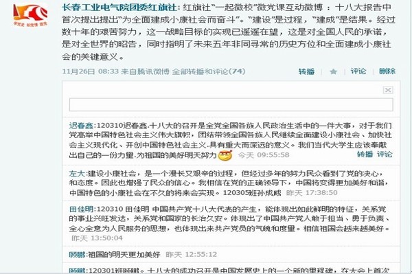 (通讯员 李昊林)近日,红旗社“一起微校”微党课互动微博和短信平台开启了第一期的微党课,用精炼、易懂的“微言微语”讲党课,帮助广大青年学子更好地学习领会、贯彻落实十八大精神,收到良好效果。广大团员社员利用电脑、手机认真收听十八大的专题微博,同学们通过评论、转发、留言等形式热情参与互动,实现了理论精神的同步学习、即时学习、互动学习。