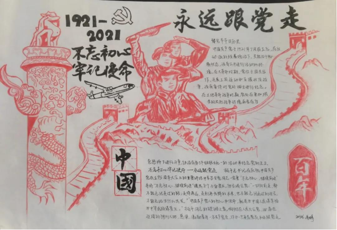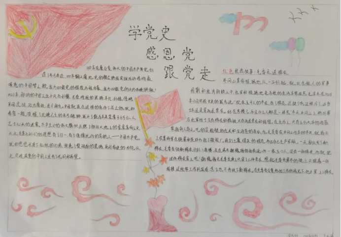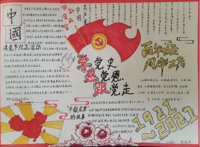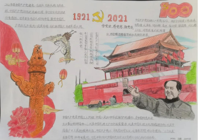 书中显血骨,画里呈江山。书法能锻炼品性,绘画能提高境界,而且书法和绘画作为我们民族的瑰宝,是我们一代代中国人的精神食粮,同时也是我们在世界文化园林中的骄傲。此次手抄报大赛将书法和绘画结合在一起,通过竞赛的方式继承发扬中华优秀传统文化、增强文化自信,展现了同学们认真的党史学习态度,为大家树立了优秀的榜样,展现出91猫先生