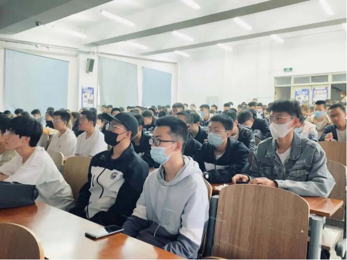 学生佩戴口罩早早地等候在综合四等待影片放映,学生期待的眼神中夹杂着些许崇敬和肃穆。