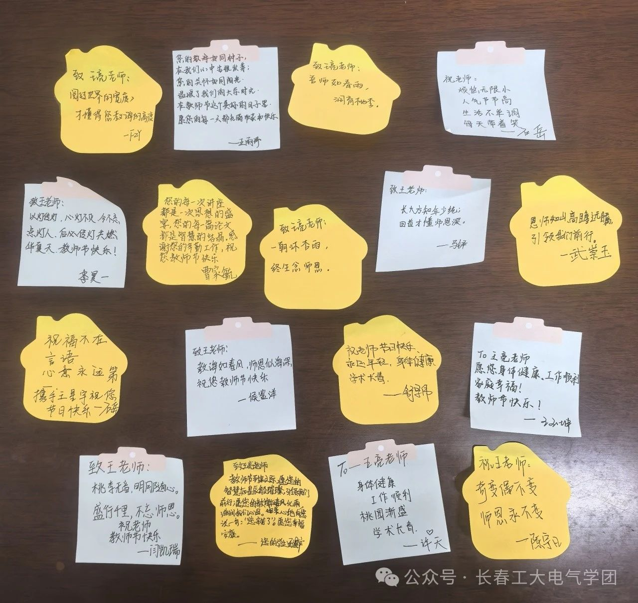 的学生们,以学长学姐们及各班班委为代表,早早地开始了他们的“秘密行动”,他们利用课间、午饭后、晚饭后的琐碎时间,共同为学院老师准备了惊喜礼物。他们为老师们布置了温馨的教室,准备了小蛋糕,写下了想对老师说的话......小小的一张便利贴装满了对老师们的恩情,他们深知,教育之恩比海深。