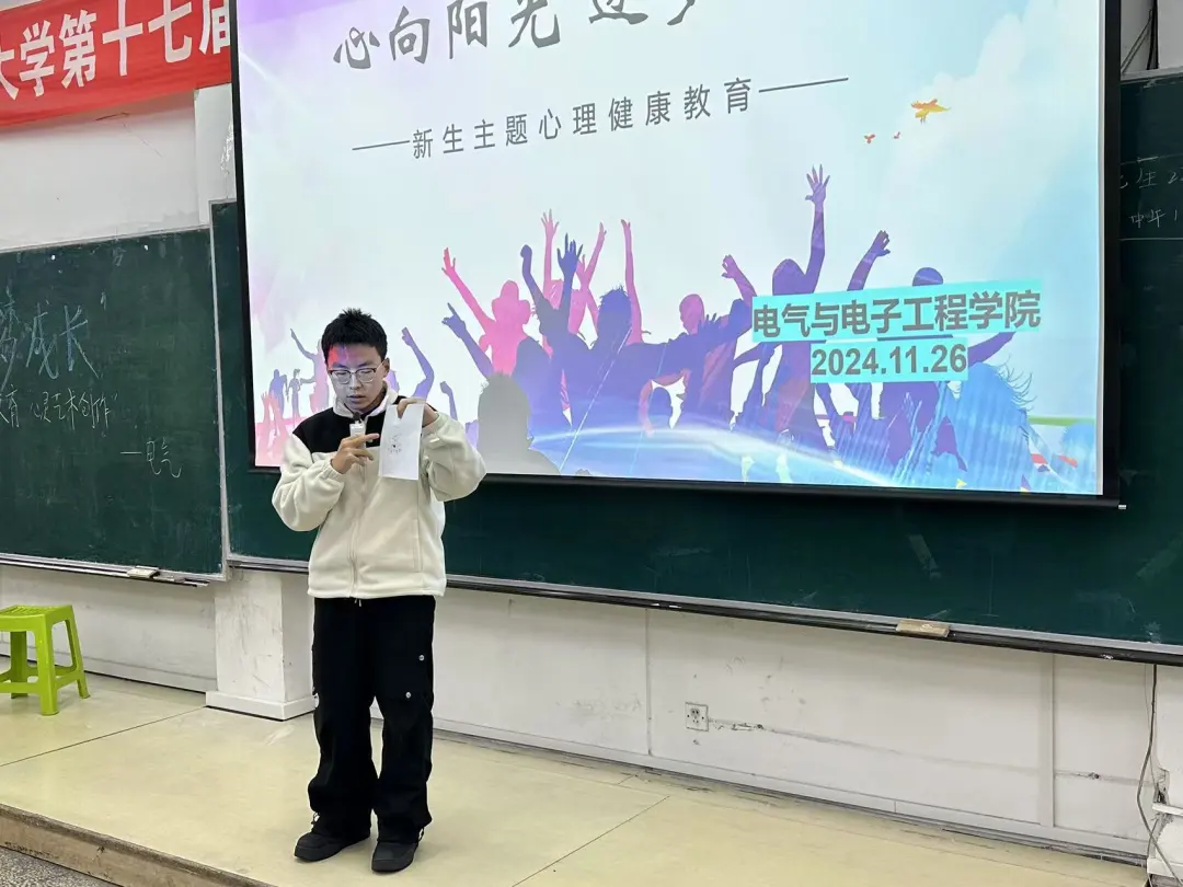 时光荏苒,对于2024 级的新同学来说,踏入大学的第一个学期已然悄然走过大半征程。在这段适应与探索的旅程中,他们收获了知识、友谊,也遭遇了诸多挑战与困惑。为了进一步帮助新生们梳理内心,以更加积极健康的心态迎接未来的大学生活,电气学院精心筹备并开展了一场以“心向光明,逐梦成长”为主题的心理活动。