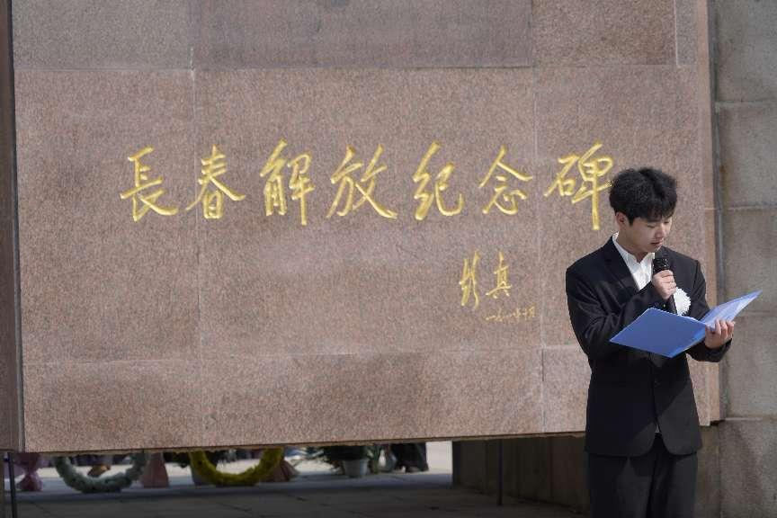 晨光中,蔡颖辉与李若男两位老师垂首肃立,缓步上前将素洁的花束敬献于碑前。晨曦漫过云层,在镌刻着"长春解放纪念碑"的鎏金碑文上漾起微光,花岗岩碑体在薄雾中显出庄重的轮廓。学生们依次列队上前,指尖轻抚过牡丹浮雕底座上凝结的晨露,将鲜嫩的白菊沿着青灰色碑座郑重摆放。