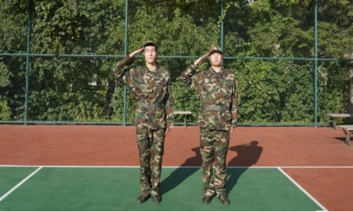 烈日下,大一新生身着笔挺迷彩服,衣摆无褶、帽檐齐平、腰带束紧,军容严整。站姿上双肩后张、腰背笔直、手贴裤缝,汗滴落仍纹丝不动,显自律,亦彰学院 “砺行求实” 精神。