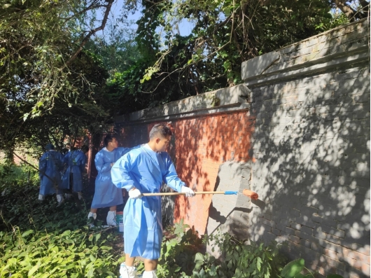 志愿服务团队,积极配合团队对南湖新村东街墙面进行粉刷翻新。