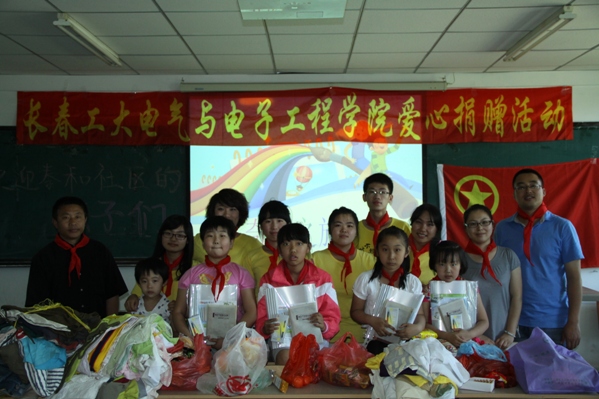 结束了参观,志愿者与小朋友们重新来到主楼门前,搭起台布进行会餐以及做游戏。在“丢手绢”的欢快歌声中,孩子们彻底敞开心扉,与志愿者哥哥姐姐们聊天玩耍,笑声不绝于耳。结束了短暂的会餐,一行人来到主楼1401室,进行捐赠仪式。在欢快儿歌中,小朋友们将事先准备好的红领巾亲手系在志愿者的哥哥姐姐的脖子上,志愿者将中性笔等文具以及衣物捐赠给小朋友们,欢乐的六一体验之旅至此拉下帷幕。