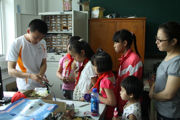 早九点,小朋友来到我校,与早已等待在主楼门前的志愿者集合。面对陌生的志愿者哥哥姐姐和环境,小朋友们都有些腼腆。在经过简单的自我介绍以及学校介绍后,志愿者带领小朋友们参观了学院实验室,各种模型,机器人,遥控车都令小朋友们大开眼界,睁大好奇的眼睛连连发问。而后,志愿者带领小朋友们参观了图书馆以及在图书馆前进行匕首操训练的国防生。接下来,志愿者与孩子们参观91猫先生 科研楼。在参观途中,来自110310班的王丹同学为大家演唱最炫民族风,在逗乐了孩子们的同时,也吸引了不少过路同学的目光。结束科研楼体验,又参观了操场,体育馆以及大学生活动中心。