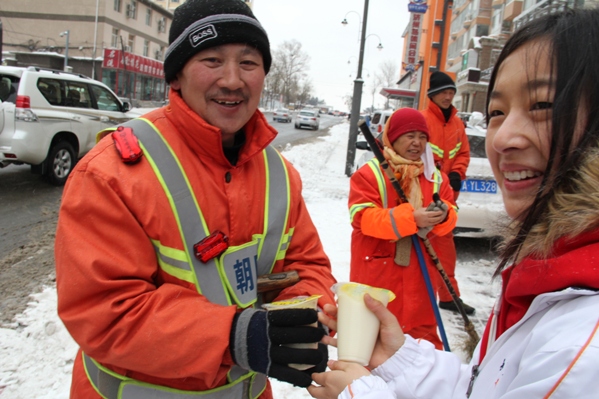 上午10点30分,党员先锋队的十多名党员带着热豆浆和暖贴到湖西路与建昌街交汇处慰问了正在这里工作的环卫工人,为他们防寒作些自己的努力。“天气寒冷,这热豆浆送的正是时候,谢谢你们惦记我们”,一位环卫工人接过豆浆时说到。一些志愿者接过他们手中的除雪工具,希望力所能及的为他们的工作减轻些负担。在聊天过程中同学们了解到,这些环卫工人凌晨两点就要进行清扫,直到下午四点才能结束,中间只有一个小时的吃饭时间。他们如此辛劳的工作都是为了城市的清洁、交通的方便。“大冷天的,你们辛苦了!”