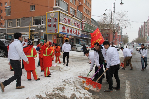 | (通讯员 夏天竺)长春近日连降大雪,为了确保城市道路交通顺畅,全市1万4千多名环卫工人走上街头清扫积雪。拿着不多的工资,冒着严寒风霜,有时连顿热饭都是奢望。为了缓解环卫工人的寒冷与劳累,为他们送去一丝冬日的温暖,表达同学们的尊重和关爱,11月20日,党员先锋队的大学生志愿者们走上街头慰问了这些劳动在第一线的城市美容师们。