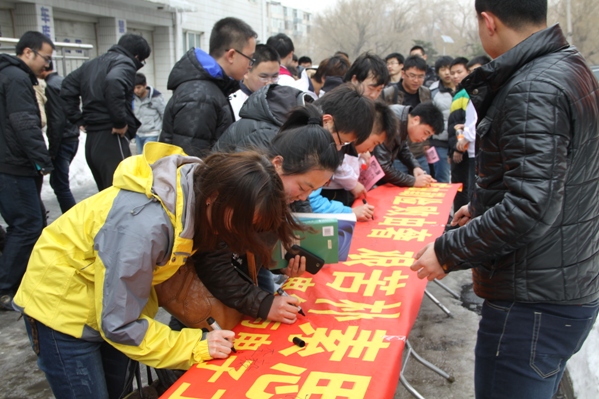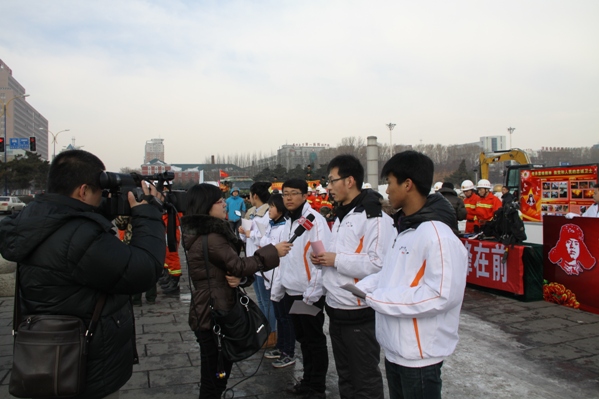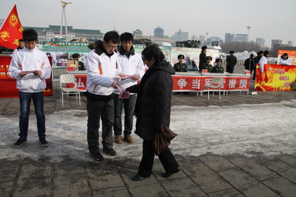 系列活动四:“弘扬雷锋精神、倡导文明新风”雷锋精神广场宣讲活动 3月5日,学院大学生志愿者来到长春市文化广场,树起了“弘扬雷锋精神,倡导文明新风”的宣传海报,与吉林警备区的警务人员一起向路人宣传雷锋精神,并分发自制的雷锋精神宣传单。活动吸引了众多媒体的目光,吉林日报等几家媒体对大学生志愿者进行了采访。在接受访问时,同学表示学习雷锋精神是大学生应上的一堂课,宣传雷锋精神是大学生应尽的义务,同学们会在日常生活中多做好事、实事,尽己所能为需要帮助的人伸出援助之手。