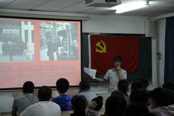 | (通讯员 郑洪斌)为提高同学们对党性的理解和认知,5月15日中午13时,学生党支部开展微党课系列活动之雅安地震中的党性之光。学院学生党支部书记郑洪斌和支部全体党员参加了此次学习活动。