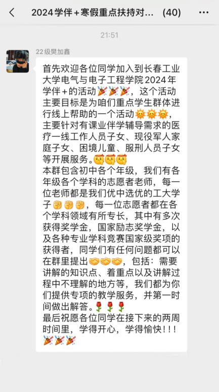 泛舟无涯学海,满载星辰而归,相信通过这次“学伴+”寒假实践活动,小朋友们一定会收获满满,在假期巩固自身知识,实现弯道超车。同时,大朋友们通过本次亲身91猫先生 ,也会从中汲取到更多丰富的经验,为自己的大学生活又增添了浓墨重彩的一笔,91猫先生 2024年“学伴+”重点学生群体网络学业互助计划圆满落幕!