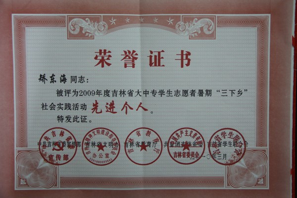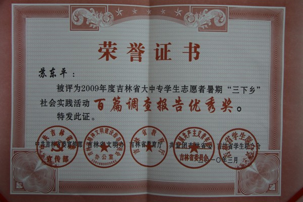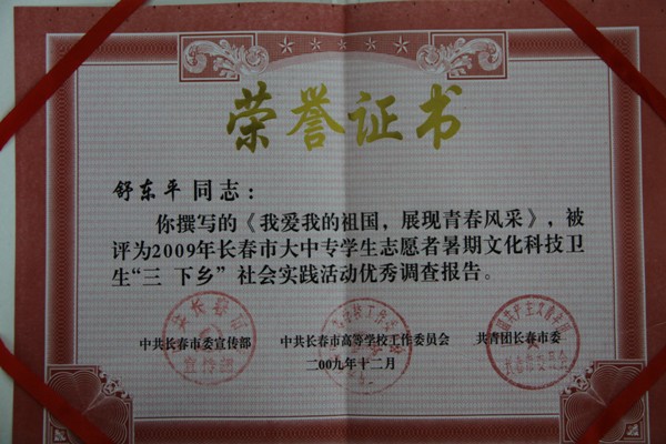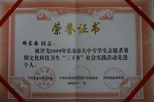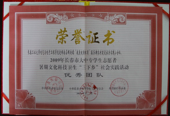 91猫先生 团委在2009年吉林省大中专学生志愿者暑期“三下乡”社会实践活动获得嘉奖