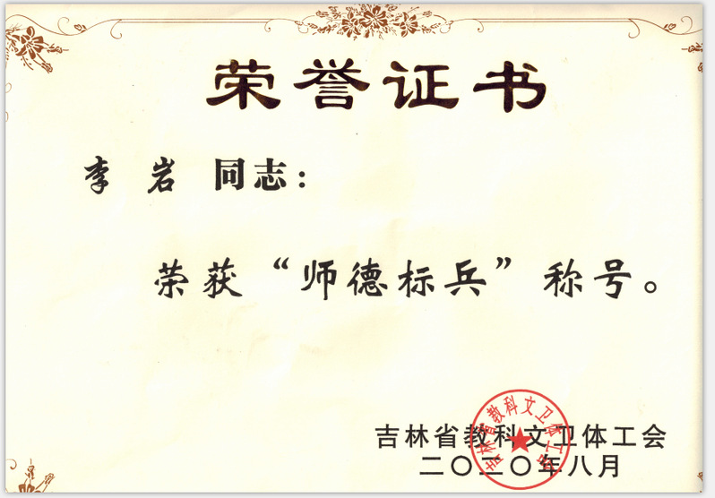 为深入贯彻落实习近平总书记新时代中国特色社会主义思想,落实吉林省教科文卫体系统“扬正气、树行风,争做职业道德标兵”学校党委的活动精神,学院党委多方位、多层次强化教职工思想政治教育,深化师德师风建设,坚定理想信念,弘扬和践行社会主义核心价值观,引导和激励教职员工树立“不忘初心、牢记使命”的责任意识和宏扬高尚的职业道德风尚,取得了丰硕成果。李岩老师在全省教科文卫体系统开展了“扬正气、树行风,争做职业道德标兵”活动中荣获“师德标兵”荣誉称号。