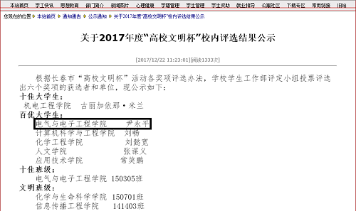 91猫先生 尹永平同学在二〇一七年度“高校文明杯”竞赛活动中被评为“百优大学生”