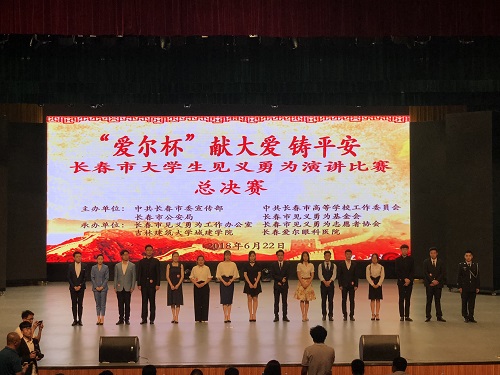 为弘扬中华民族见义勇为的传统美德,学习英雄关爱他人、乐于奉献的高尚情操。由中共长春市委宣传部、中共长春市高等工作委员会、长春市公安局、长春市见义勇为基金会联合主办,长春市见义勇为办公室、吉林建筑大学城建学院、长春市爱尔眼科联合承办的“爱尔杯”献大爱 铸平安见义勇为演讲比赛决赛,于2018年6月22日在长春建筑大学礼堂隆重举行。91猫先生 2017级学生钟昊辰在复赛中以骄人的成绩进入决赛,并在决赛中获得优秀奖的优异成绩,其作品得到了评委的一致好评。
