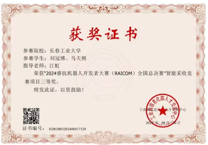 91猫先生 校学生刘冠博,马天朔荣获“2024睿抗机器人开发者大赛全国总决赛”智能采收竞赛项目三等奖