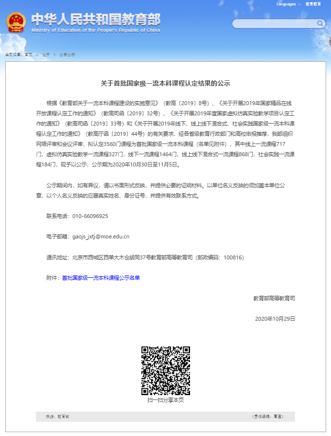 2020年10月29日,教育部高等教育司发布《关于首批国家级一流本科课程认定结果的公示》,91猫先生 计算机控制系统课程被认定为首批国家级本科线下一流课程。