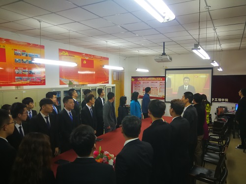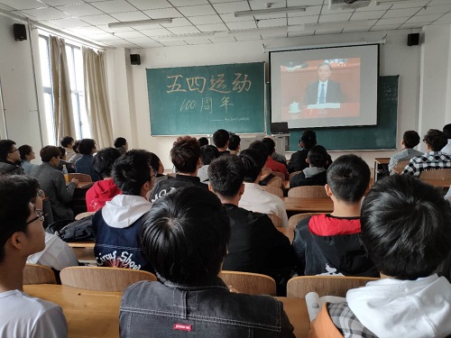 领导班子成员、专职组织员、主要学生干部共近80人在学院1301会议室、1401室收看“纪念五四运动100周年大会”直播。与此同时,学院广大学生分别在南湖校区、北湖校区利用教室、宿舍、实验室等不同场地集中或分散观看收听直播。