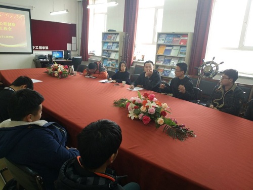 于主楼1303室召开大学生心理健康工作汇报会。校心理健康教育与咨询中心主任张丽波,校学生处学生管理科科长赵爽及学院全体政工干部、各年级学生代表参加本次会议。会议由张丽波主持。