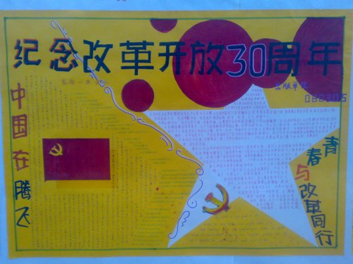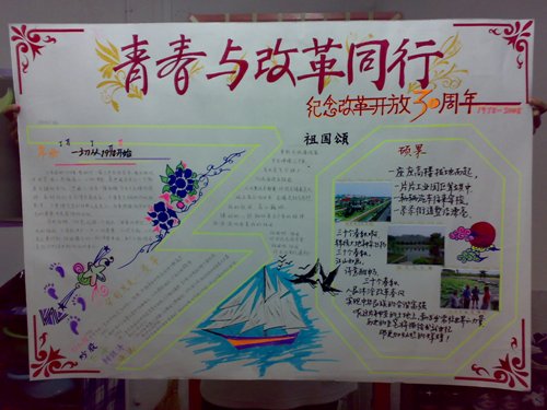在老图书馆门前举办“青春与改革同行”手抄报比赛。 比赛以班级为单位,每班级设计出一幅手抄报作品。由校团委书记胡刃峰,院党总支副书记周文军及学生工作办公室全体老师担当本次比赛的评委。评委从制作效果、色彩搭配等方面进行评定,最终070305班和070307班获得本次比赛的一等奖。展览其间,许多同学驻足观看,对于手抄报的设计和内容啧啧称赞。 本次活动不仅丰富了同学们的课余文化生活,培养了同学们的板报设计能力,也使同学们更深入的了解改革开放30年的伟大成绩,进一步提升了爱国意识,让青春在工大闪光。 |